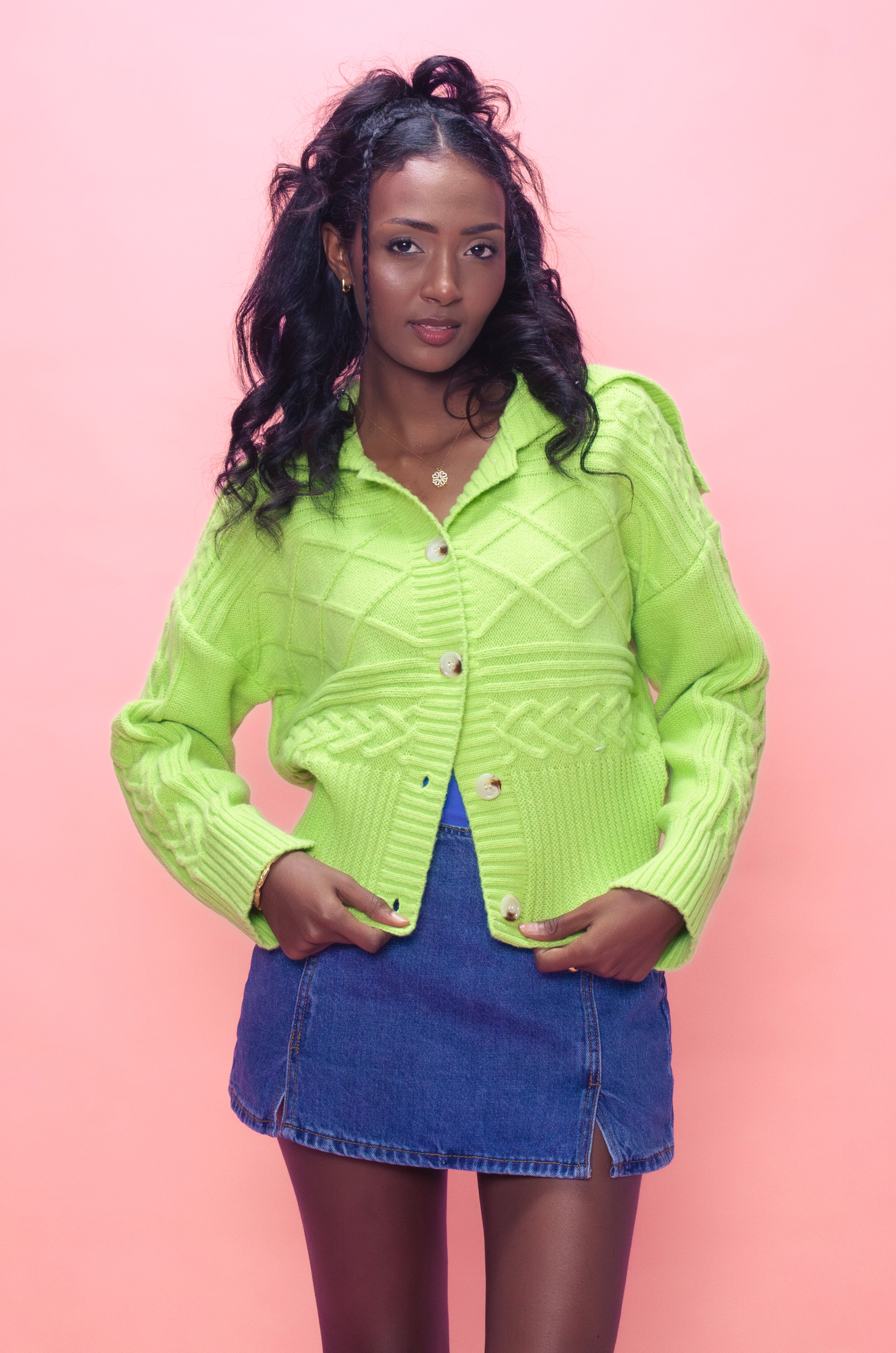 Featuring an oversized collar, intricate cable knit detail and tortoise shell buttons - this apple green cardigan is a perfect wardrobe addition for spring. Perfect for layering for chilly spring mornings or buttoned up with jeans.