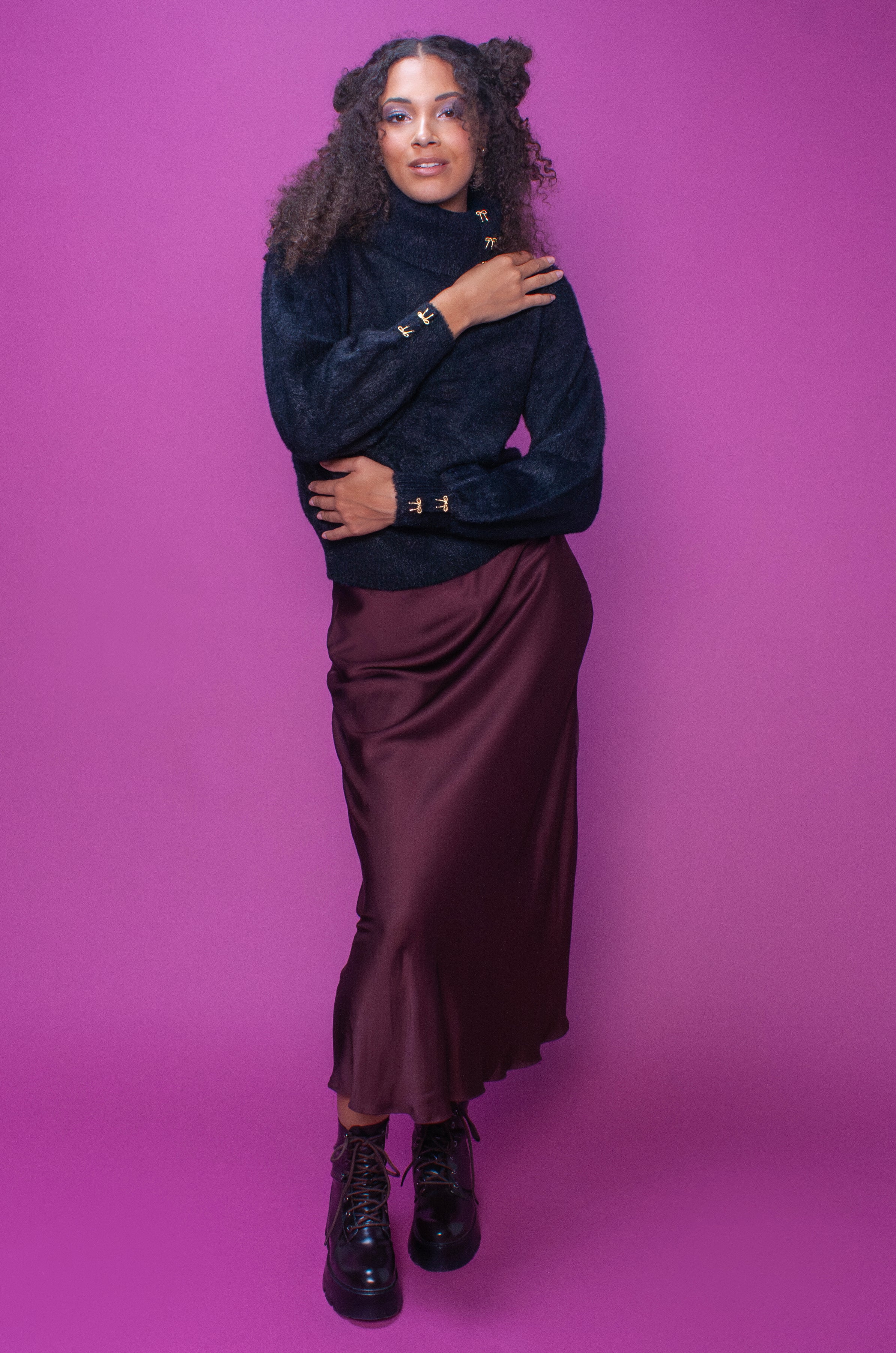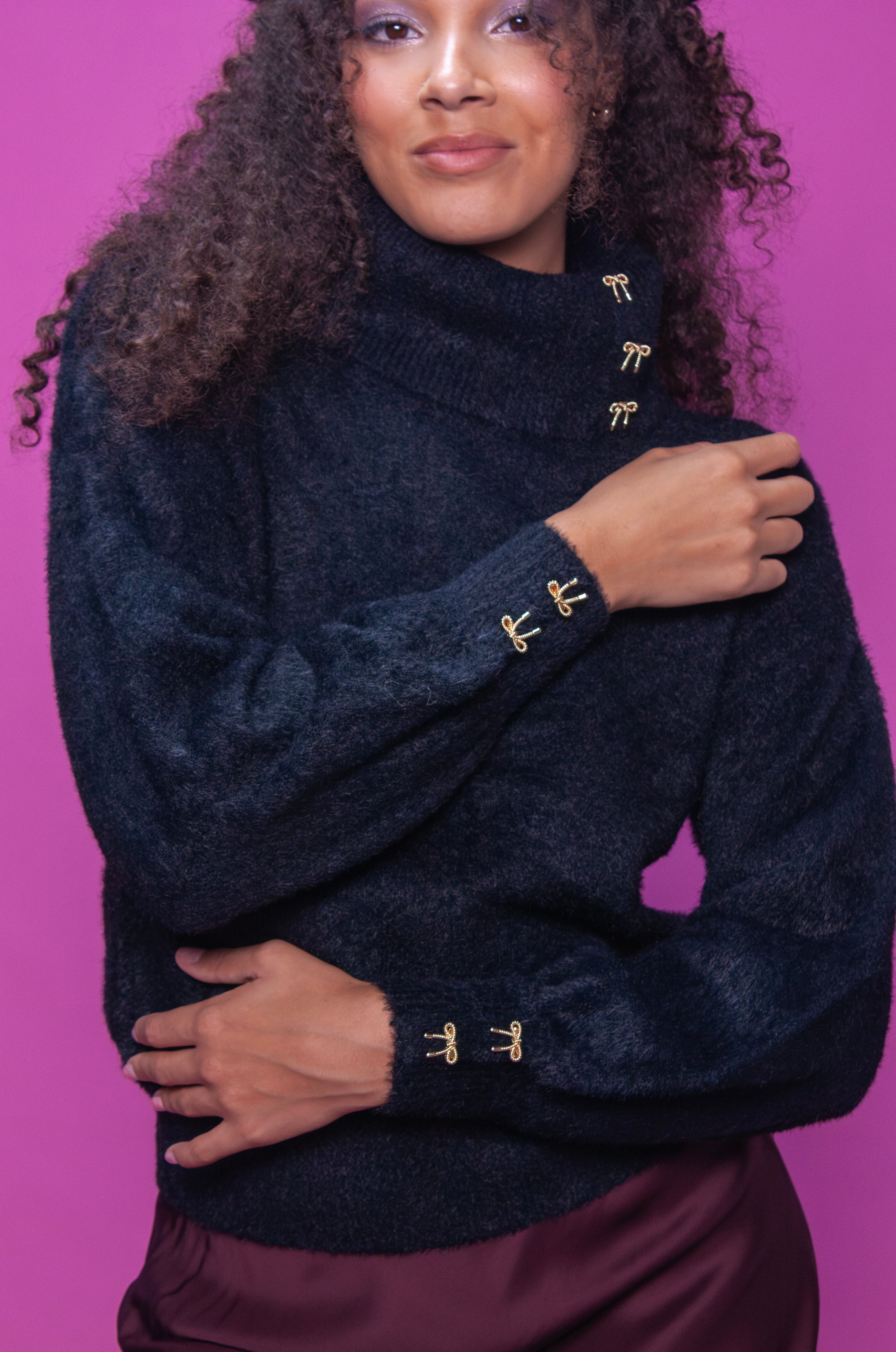 This knit is all about soft texture with subtle sparkle, a perfect elevated basic! Fluffy yarn with a cosy roll neck and gold bow studs on the neck and cuffs. Perfect with jeans for everyday sparkles or dressed up with a satin skirt for evening's under twinkling lights!