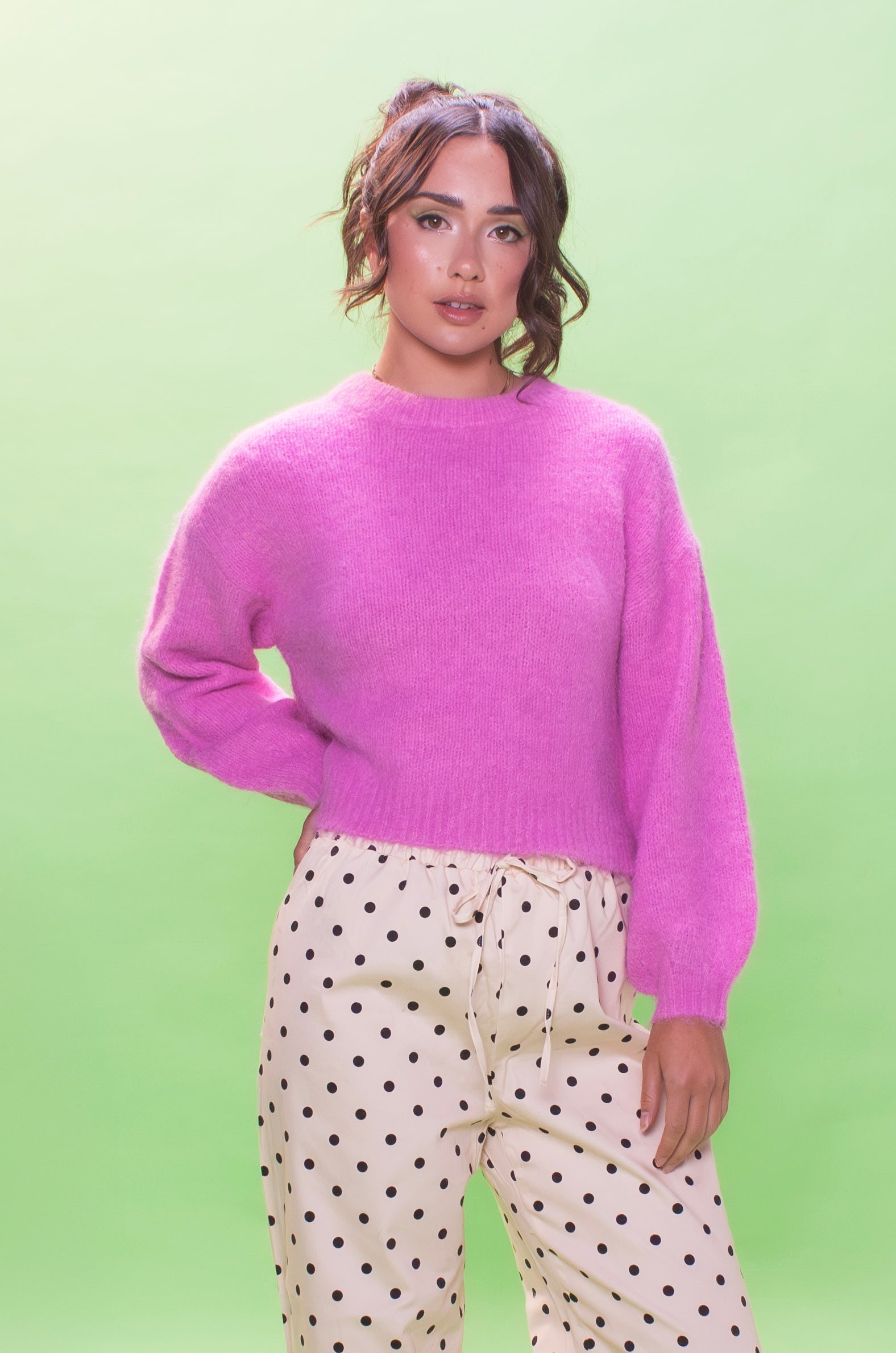 Add a girly hit of bubblegum, spun into the softest and airy jumper this season. Slightly cropped with the balloon sleeves and a chunky neckline. Its the jumper that makes layering for winter feel fun.