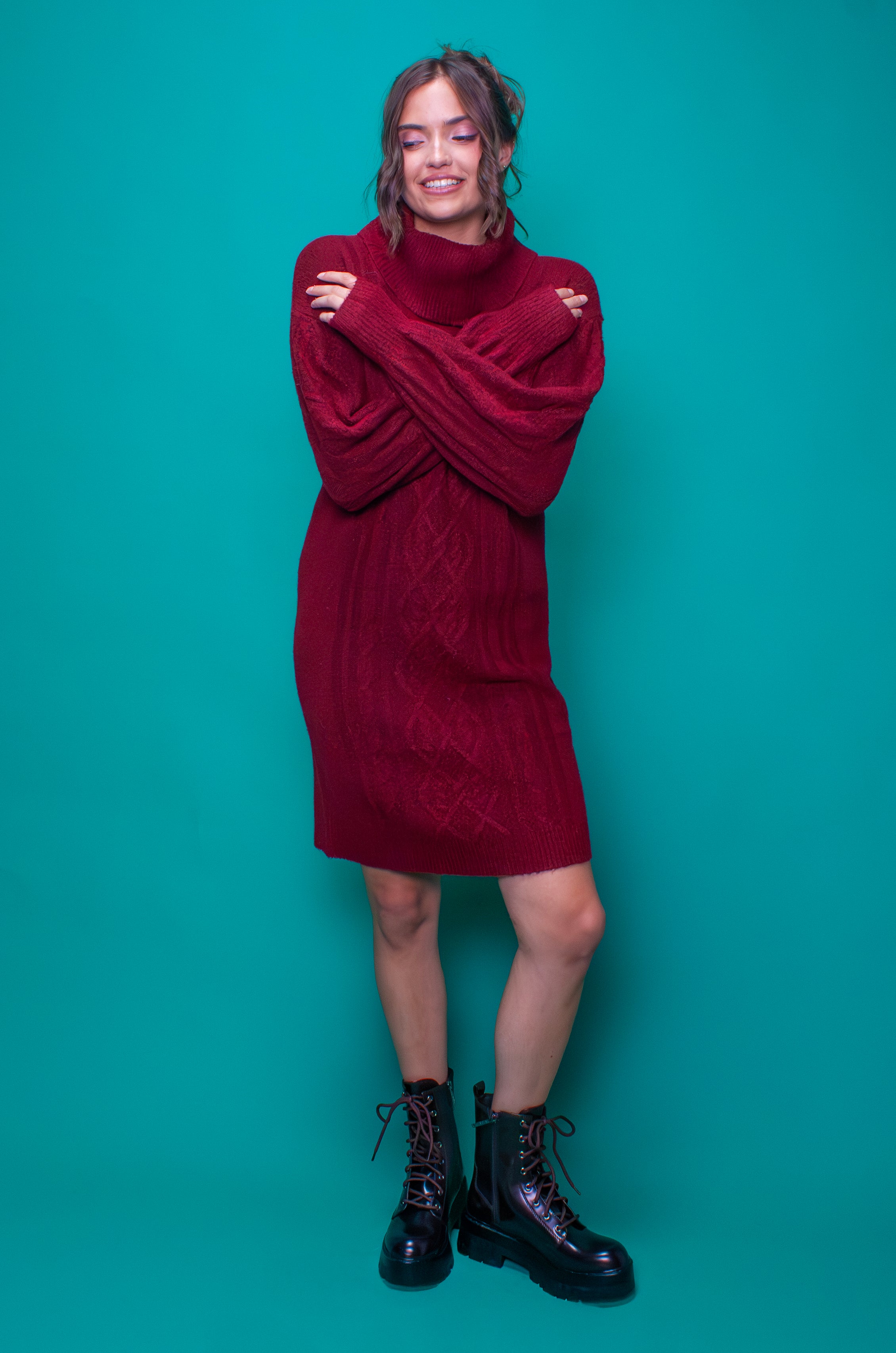 In deep wine tones and a soft cable knit design, this burgundy dress wraps you in warmth. In a relaxed fit with balloon sleeve, you'll be ready for the weather for the office and the Christmas markets.