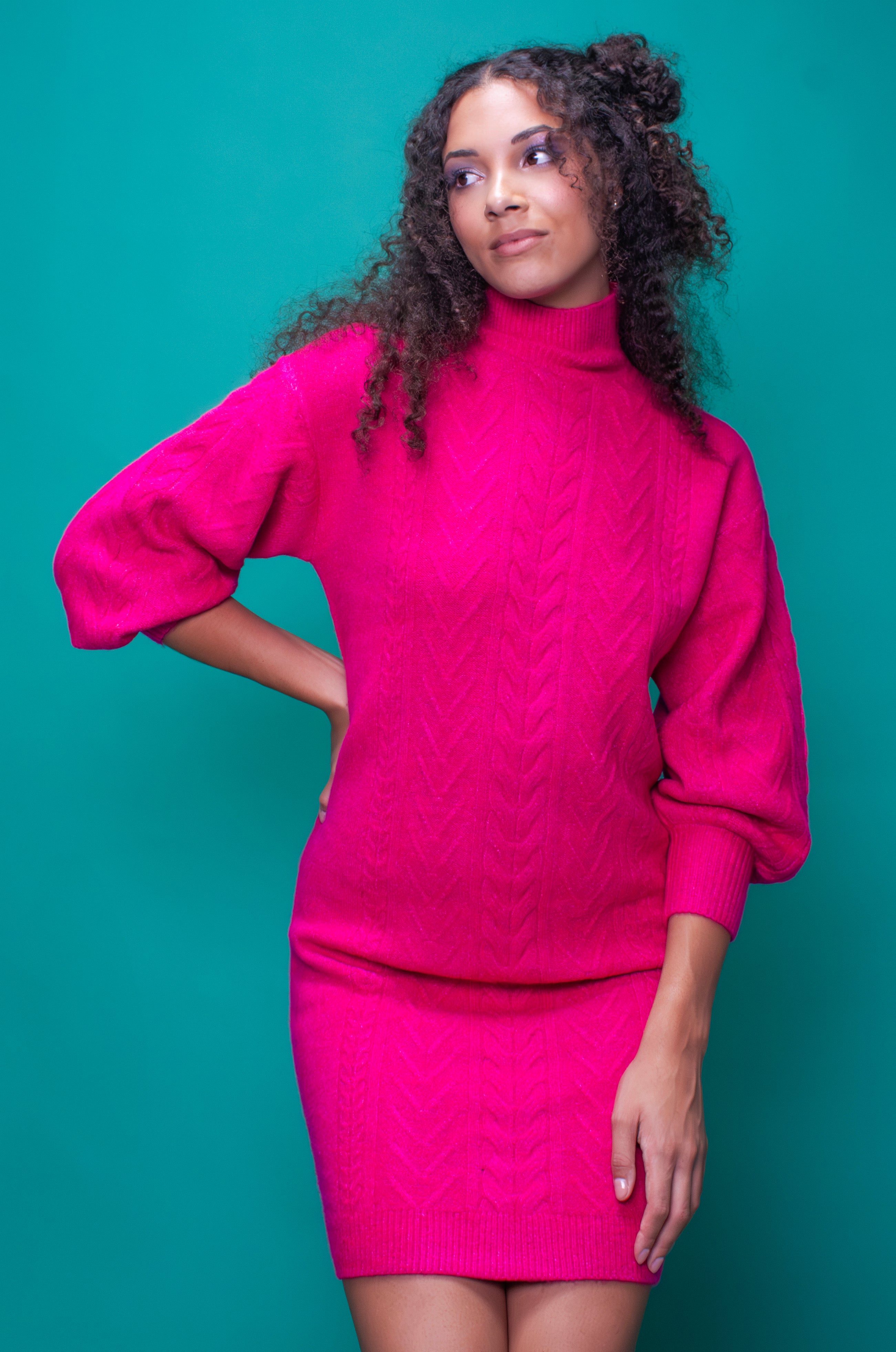 This cable knit mini dress combines a classic knitted dress with a bright pink hue and balloon sleeves. Perfect for brightening chilly days and easy to style with black boots, a black coat and probably an umbrella.