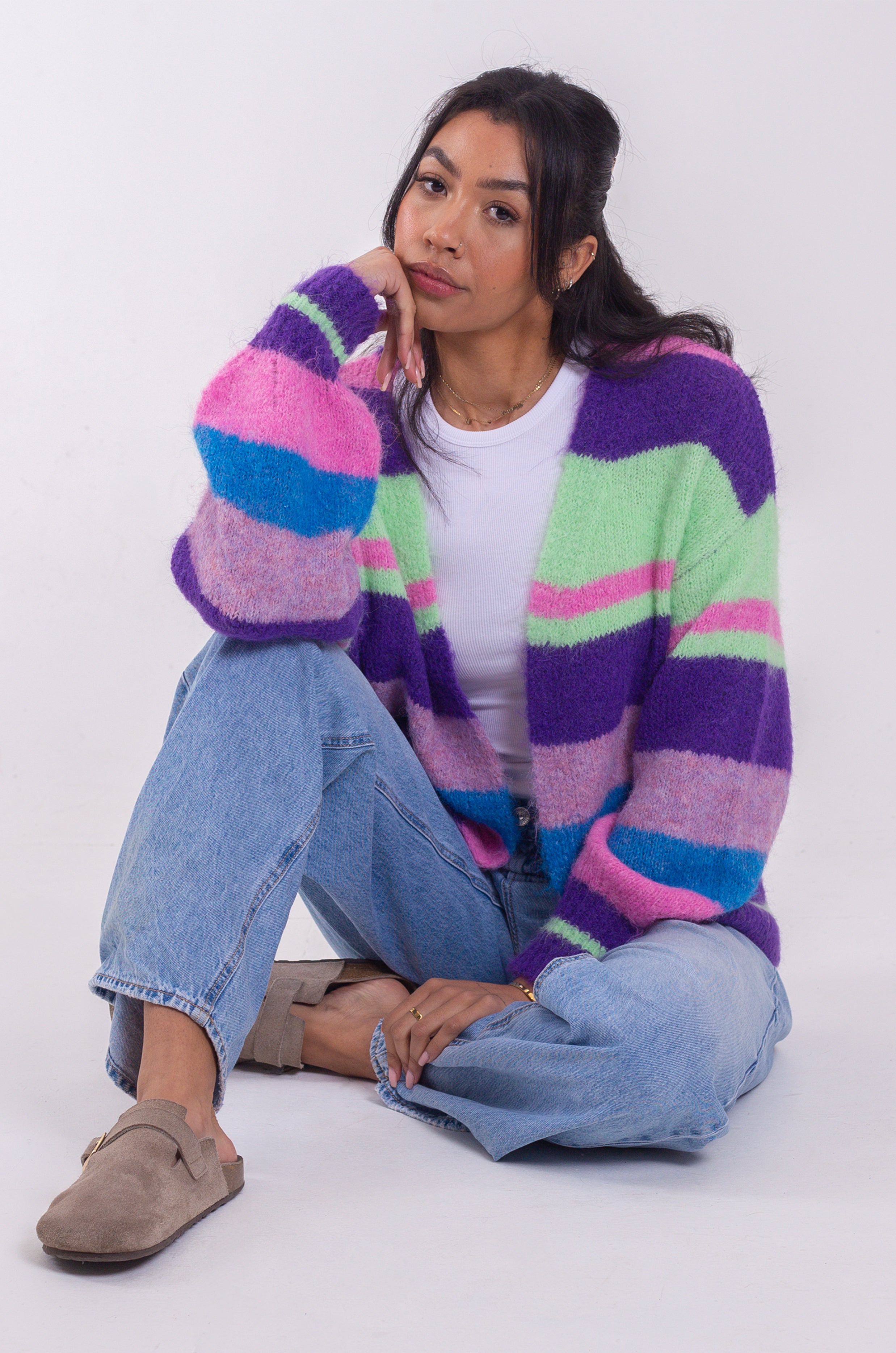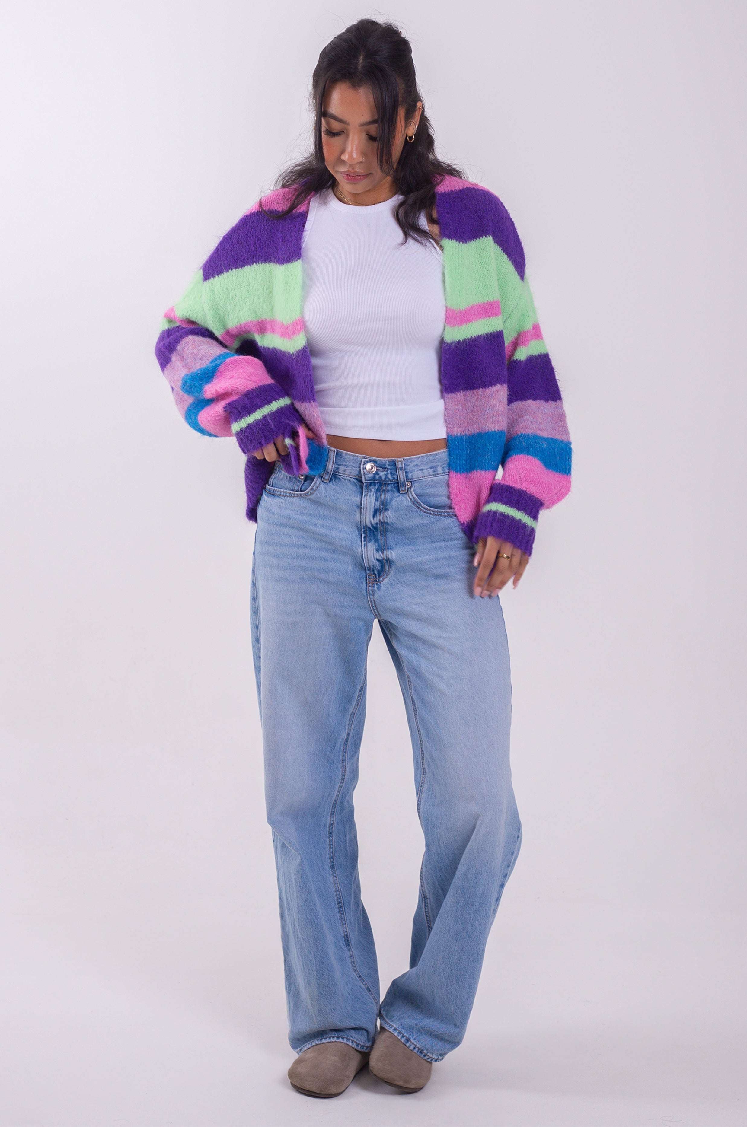 Bold and pastel colours meet to make the perfect spring layering cardigan. Sloughy balloon sleeves with super soft yarn so you're ready for any unexpected spring chills.