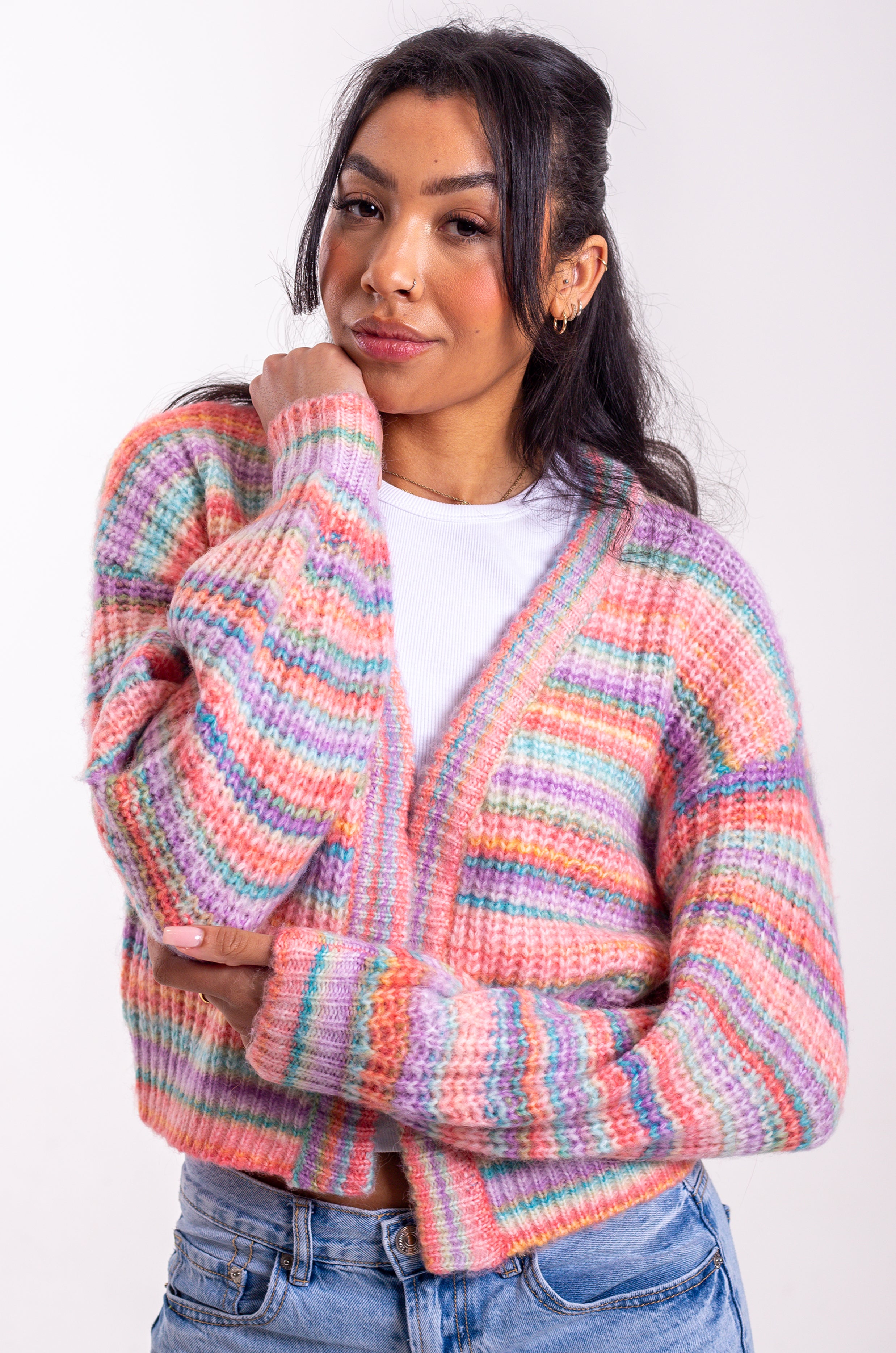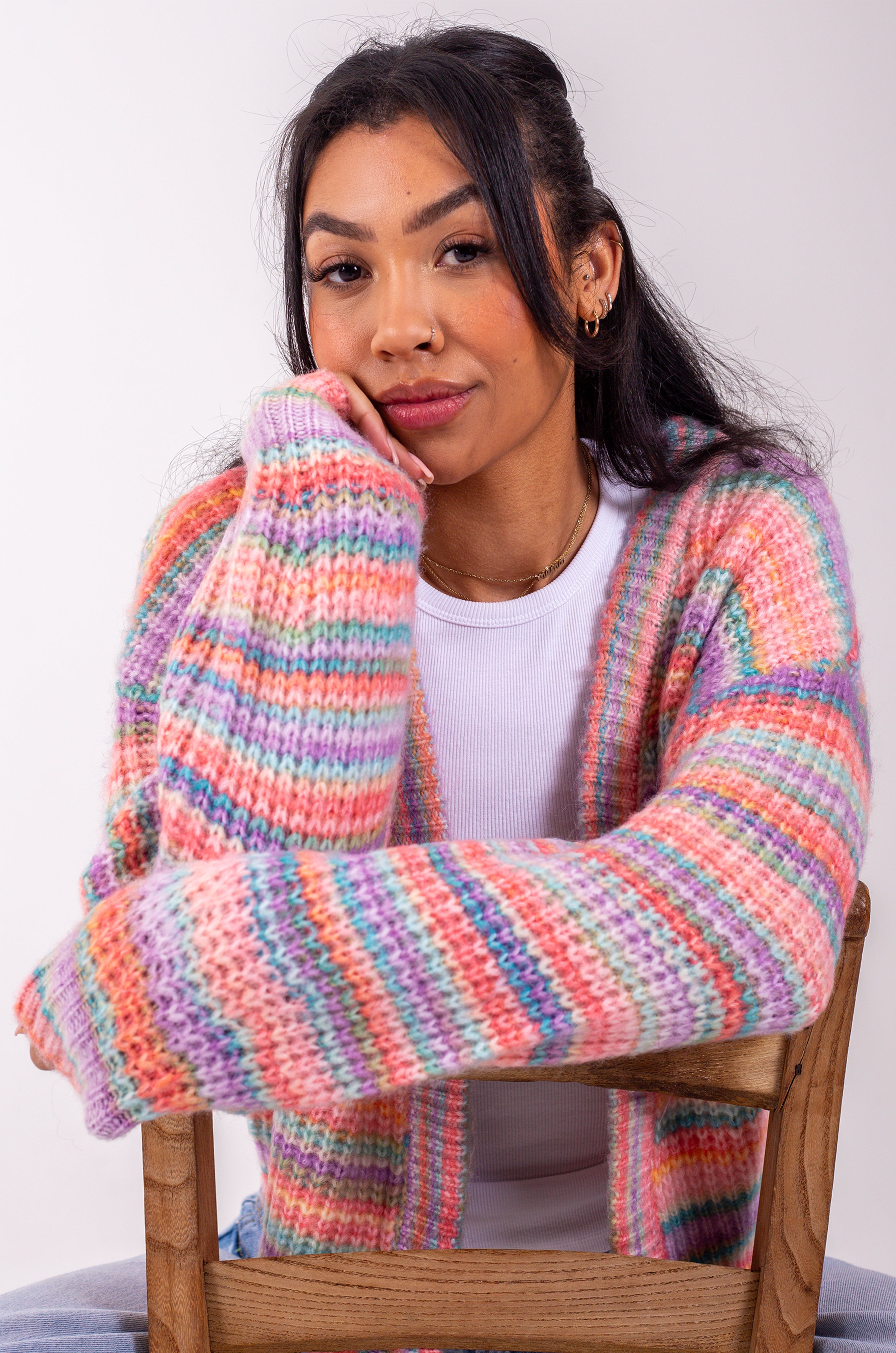 Soft, cosy and full of colour. The apricot orange base with playful pops of colour makes for the perfect layering piece for chilly spring mornings.
