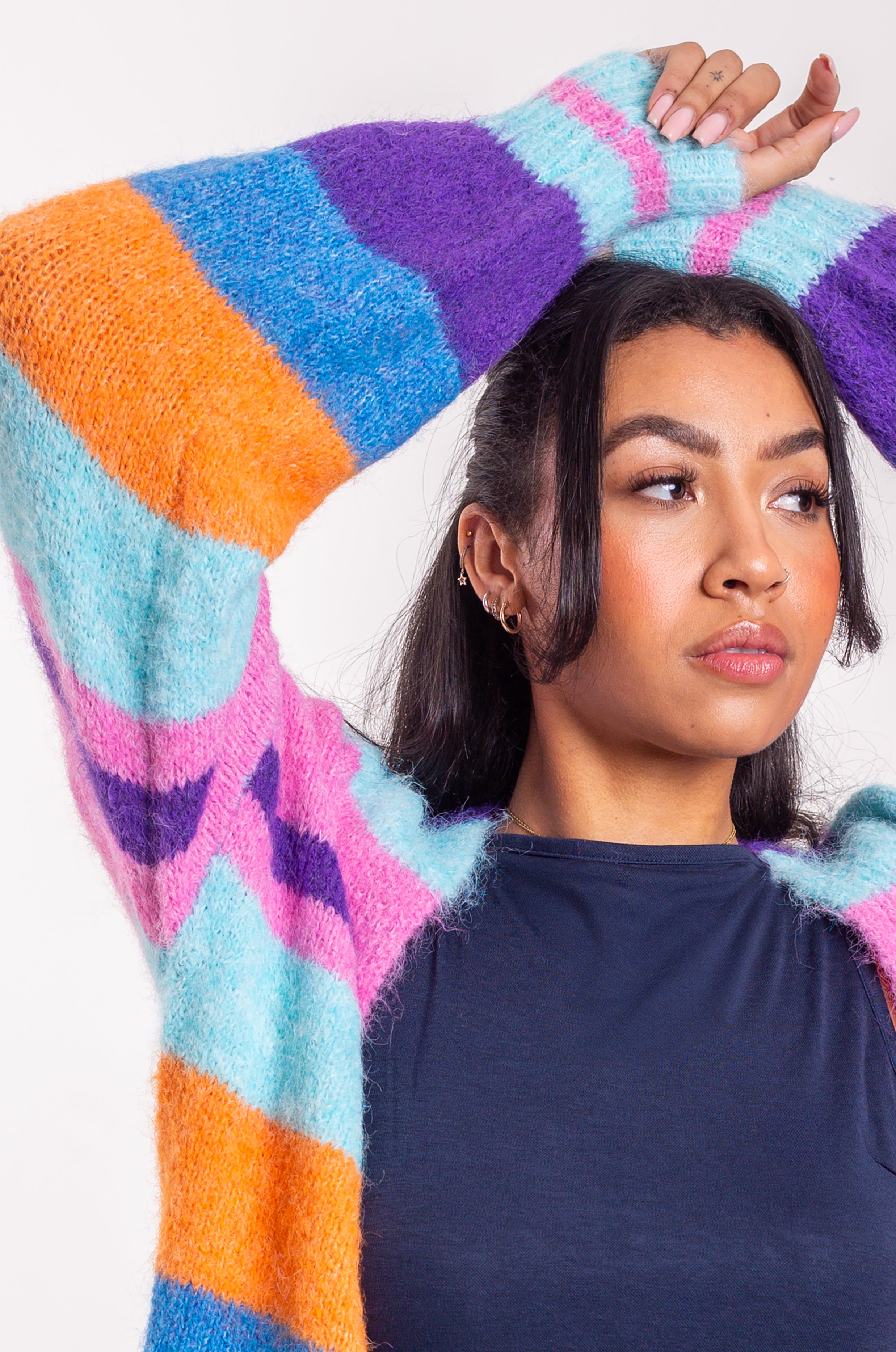 Colourful, cosy and guaranteed to brighten your day - this lofty cardigan is covered in stripes with super soft balloon sleeves.