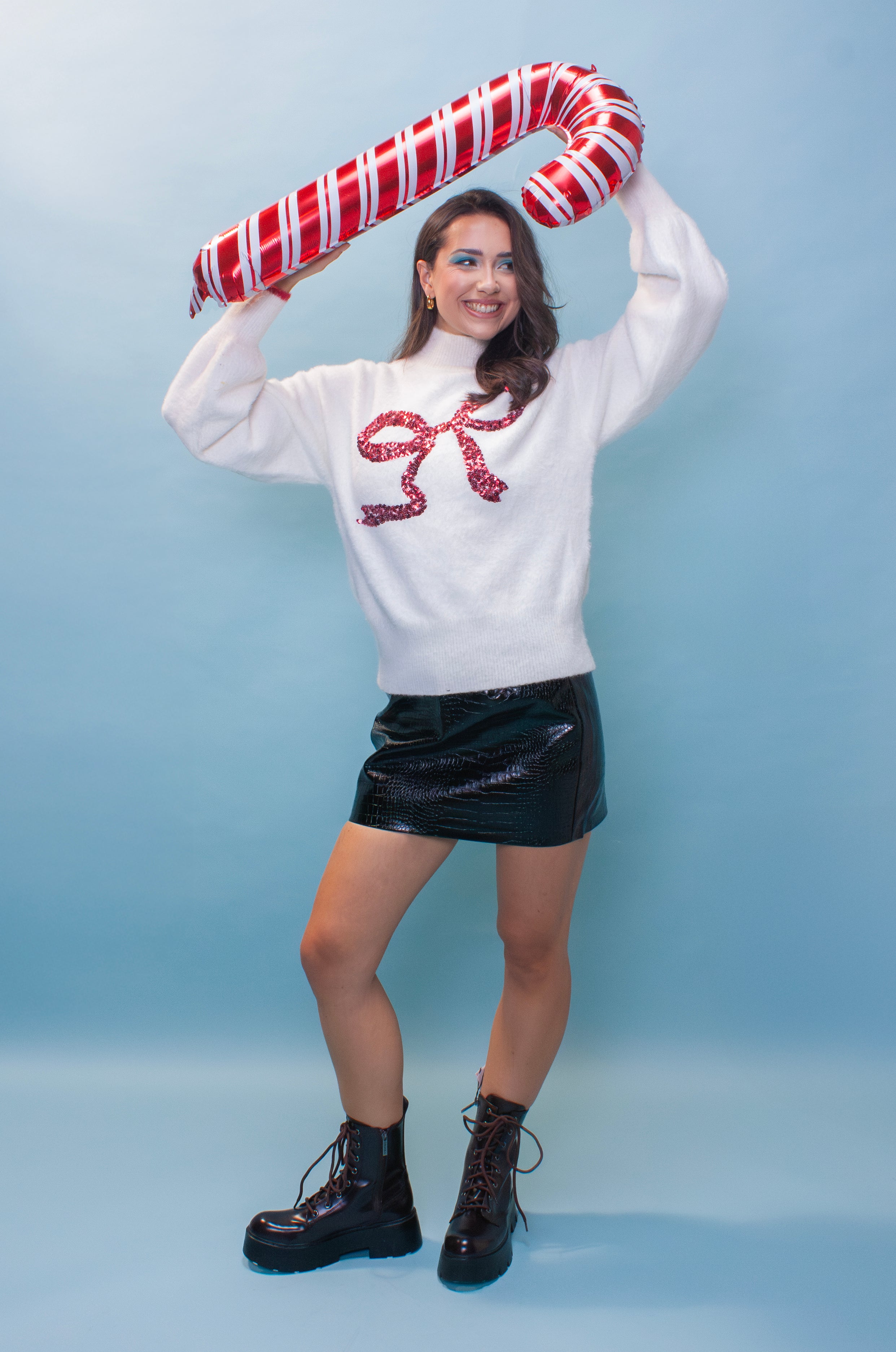 Cute, cosy and full of sparkles - made from fluffy yarn with a cosy high neck and balloon sleeve, then finished with a sparkling red sequin bow. The perfect festive jumper which will never be too early or too late to wear this winter.